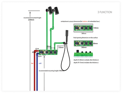 Compact yet powerful, the 3-function diverter is ideal for streamlined setups. It allows you to control up to three outlets — such as an overhead shower, hand shower, and spout — with precise temperature and flow regulation.